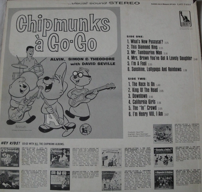 Chipmunks à Go-Go features "The Chipmunks." David Seville does not appear on the album, nor do the original Chipmunks. The Chipmunks are voiced by "studio singers," not Ross Bagdasarian, Sr. The album was re-released on LP in 1982 and again on CD in 1990.