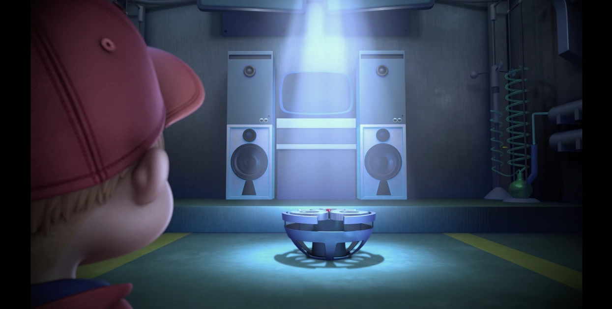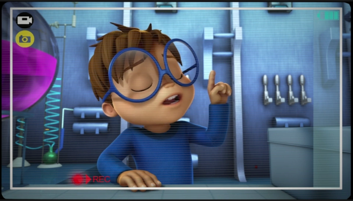 The room appears in Overlooked a couple times and shows more of the interior design. Its security includes a four digit, keypad combination but with the addition of a face scan. Simon uses the room to create a video for introducing, as well as storing, his latest invention - the invisibility suit. Once Alvin learns of the amazing invention, he uses Simon's code and a 2D image of Simon attached to a stick in order to enter and borrow Simon's prototype.